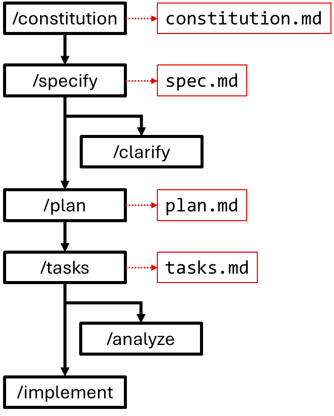 The flow keeps the what and why separate from the how. You set project rules, write the spec, answer clarifying questions, create a plan, turn it into small tasks, run a consistency check, then let the agent implement with review at each step.